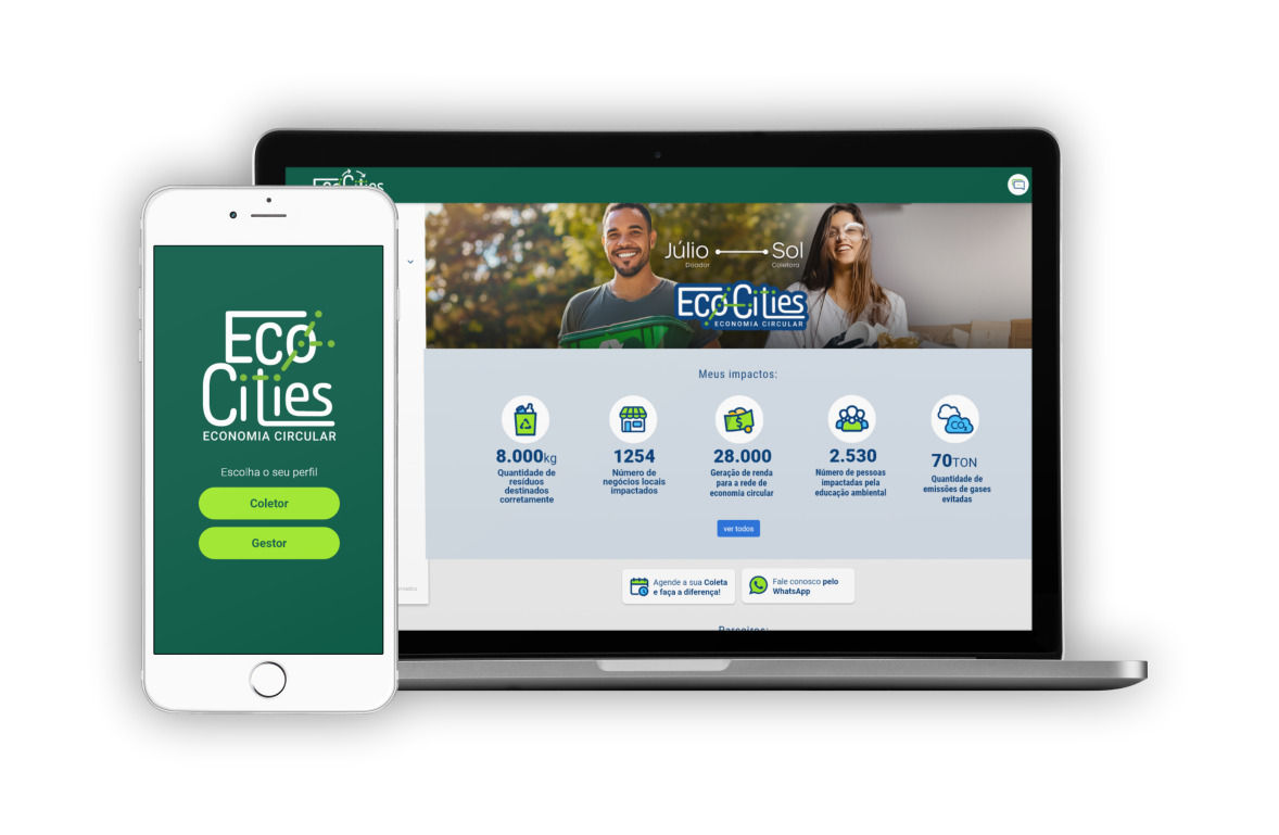 A EcoCities é uma plataforma (app e sistema web) que conecta pessoas, empresas e prefeituras para otimizar a coleta e destinação de resíduos, incentivando a economia circular.