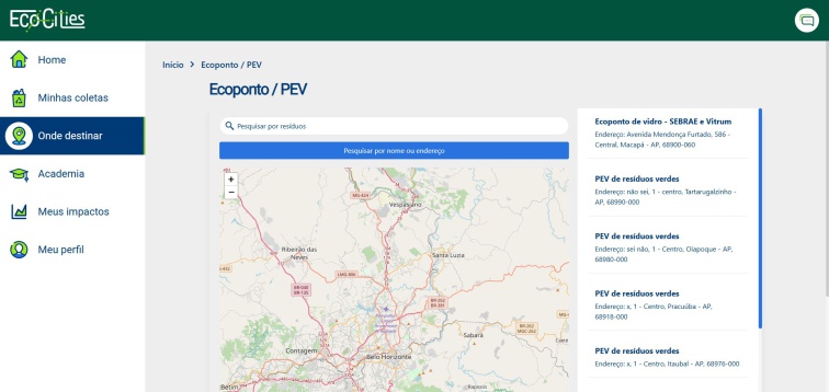 Separe seus resíduos por tipo e descubra rapidamente onde descartá-los! A EcoCities indica Pontos de Entrega Voluntária (PEVs), ecopontos e outros locais apropriados para receber os materiais que você separou.
