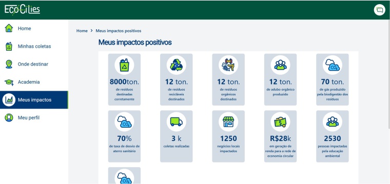 Acompanhe e compartilhe seu impacto na economia circular! Visualize indicadores como o volume de resíduos destinados corretamente, a quantidade de CO₂ evitado e muitos outros dados relevantes.